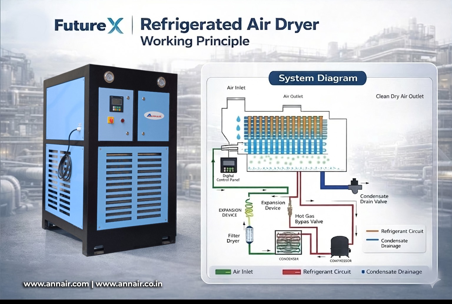Modern systems (like Annair refrigerated air dryers) come with advanced features such as: