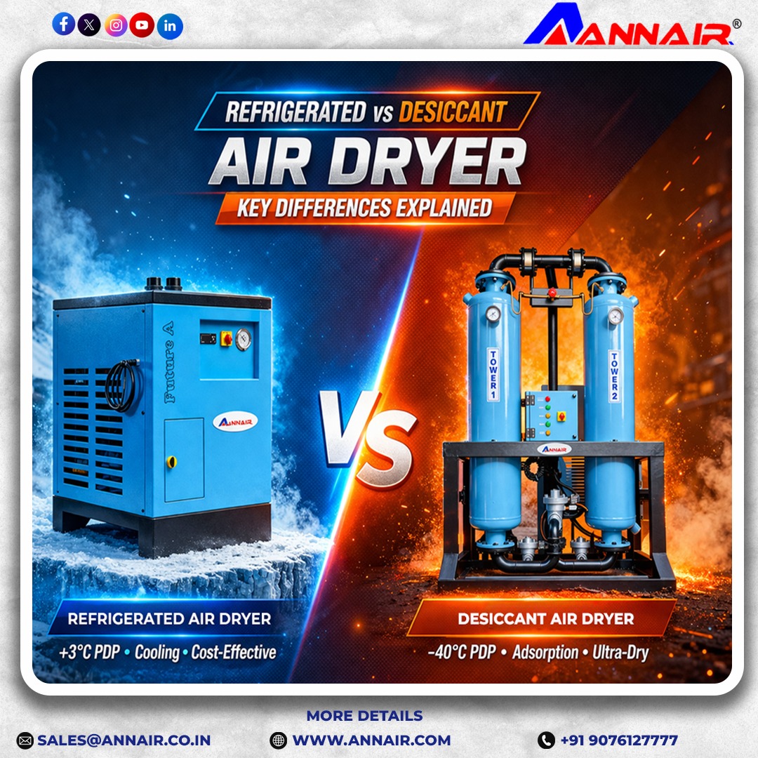 the industrial compressed air systems, moisture is one of the biggest challenges affecting performance, efficiency, and equipment life. To solve this problem, air dryers are essential. However, when it comes to choosing the right solution, many industries get confused between two major options: refrigerated air dryers and desiccant air dryers.